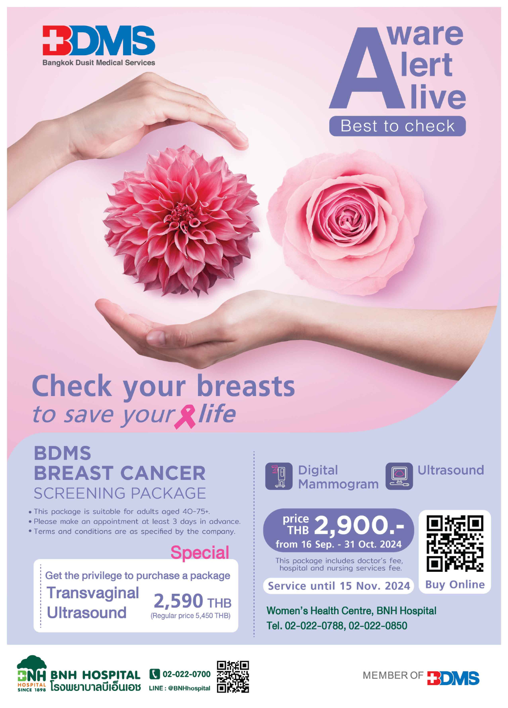 If you have no previous records at BNH, please register as a new patient at registration on the 1st floor. - Please make an appointment at least 3 days prior to using the services via LINE @BNHhospital or @Mbrace or call BNH Women’s Health Centre, 4th floor at 02-022-0788 Ext. 02-022-0850.