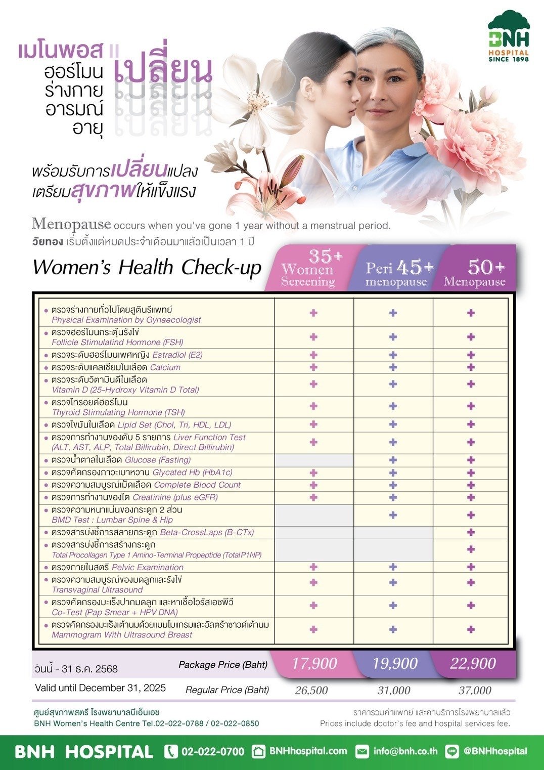 - Women Screening 35+ Package (Preparation Package for Menopause): A screening package for women aged 35 and over that includes screening for blood sugar levels, liver and kidney function, lipid profile, ovarian hormone levels, pelvic examination, complete check of uterus and ovary function, screening for cervical cancer, and screening for breast cancer.
