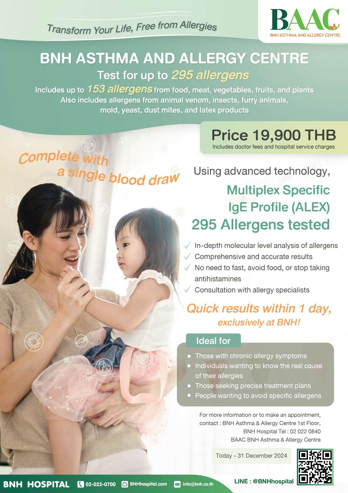 5. Services are available at the BNH Asthma and Allergy Centre (BAAC), 1st floor, Zone A, BNH Hospital, Monday – Friday from 8 am. – 5 pm. and Saturday – Sunday from 8 am. – 5 pm.